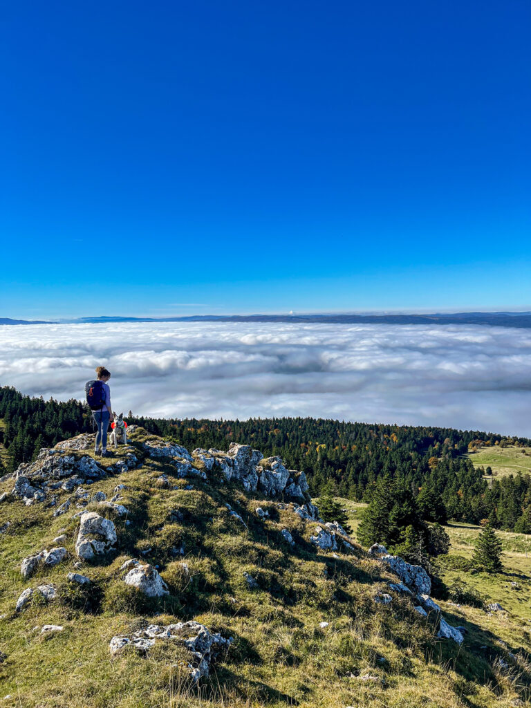 Après plusieurs kilomètres à se retourner pour admirer la beauté du paysage qui se dévoile un peu plus à chaque pas, nous voilà au sommet : le Crêt de la Goutte, qui, avec ses 1621 m d’altitude, est le plus haut sommet du Grand Crêt d’Eau. Le spectacle est grandiose : une vue à 360° sur une mer de nuages qui semble infinie. Seuls les plus hauts sommets du Bugey, du Jura et de la chaîne des Alpes (dont le fameux Mont Blanc) sont visibles.