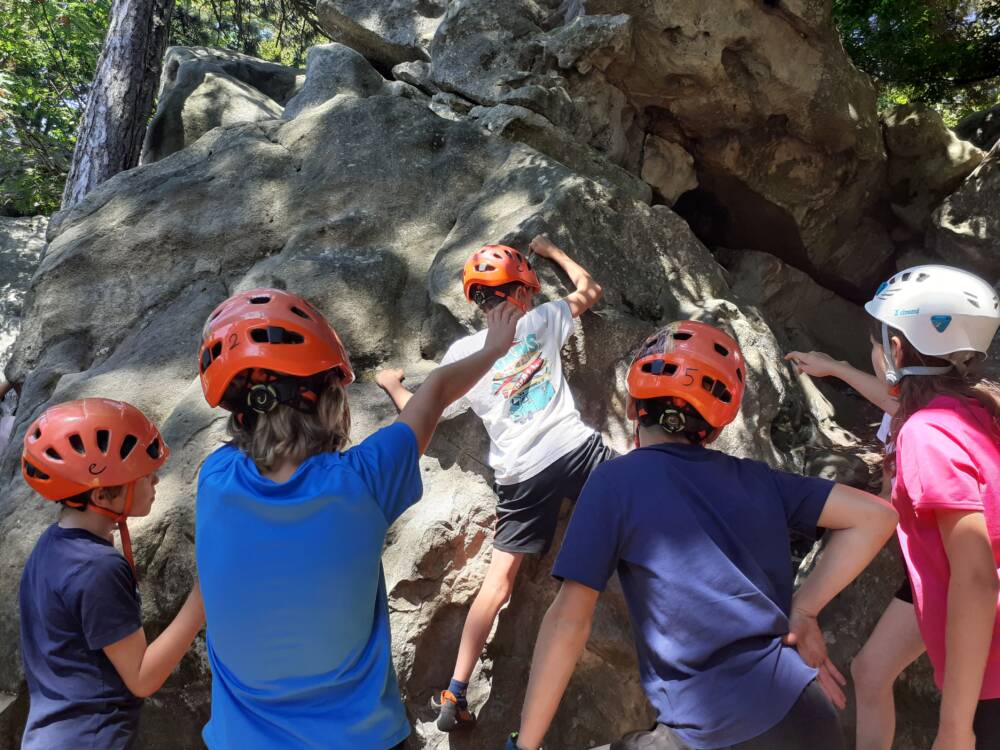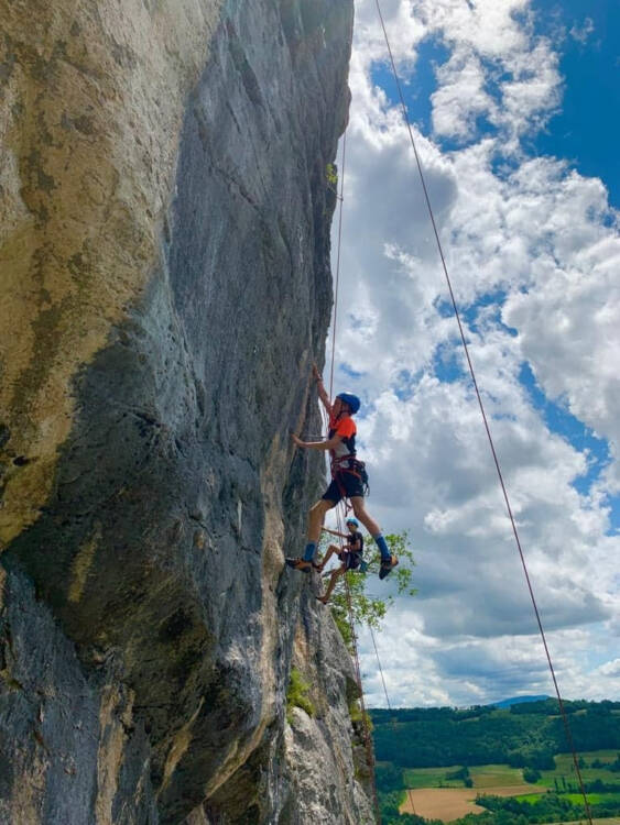 Stages avec Cortigrimpe 01. Les moniteurs emmènent les enfants grimper en falaise dans la vallée de la Valserine; une équipe passionnée par la montagne.