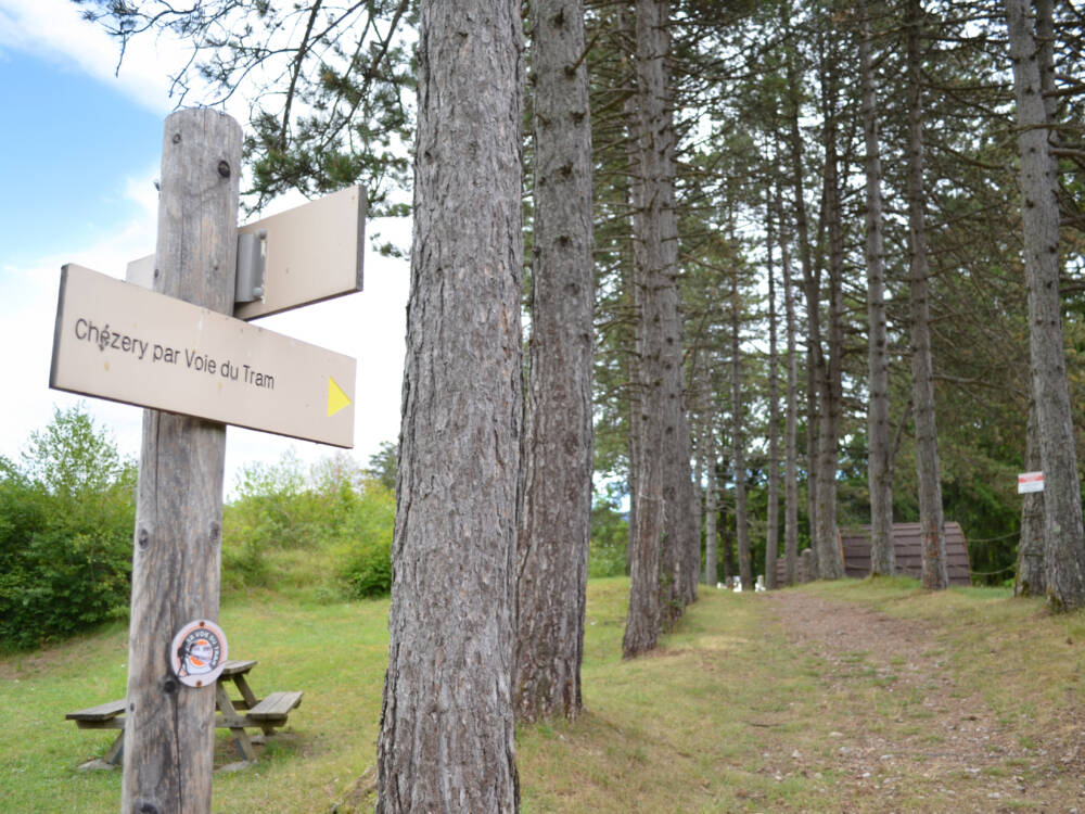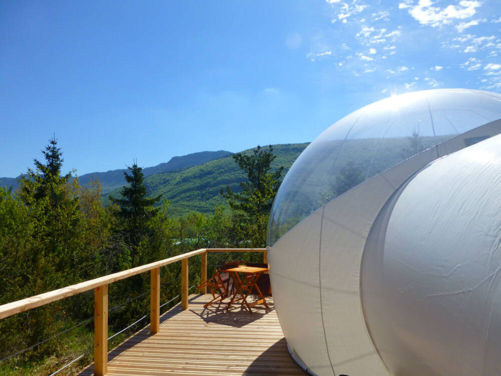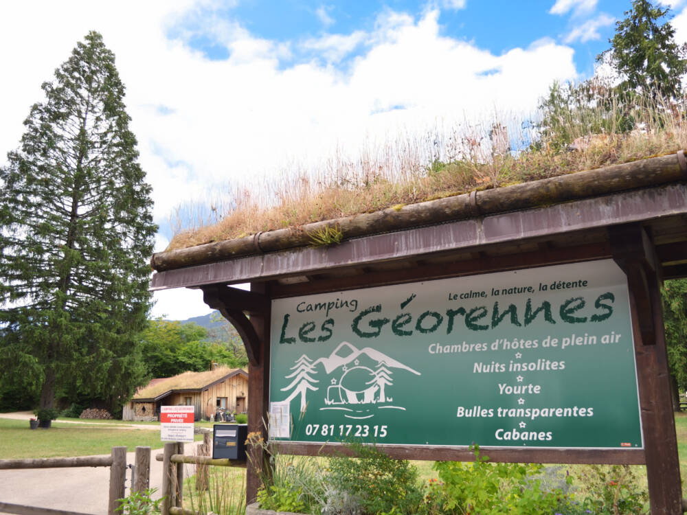 Entouré de végétation et au calme, avec une vue sur les crêtes du Haut-Jura, le domaine Les Géorennes propose différents modes d'hébergements : des places de camping en emplacements libres, aux bulles transparentes, Yourte Mongole, Cabanes Pods ou Dodôme.