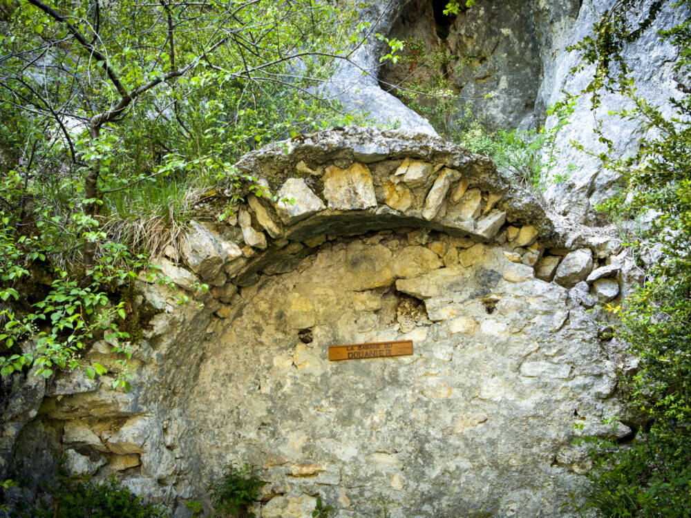2. À la sortie du tunnel que l’on vient de traverser, descendre le sentier à droite. Avant le Pont du Dragon, on repère les vestiges de la guérite des douaniers. Depuis le pont, on admire l’échelle à poissons nécessaire aux truites pour le franchissement du barrage.
