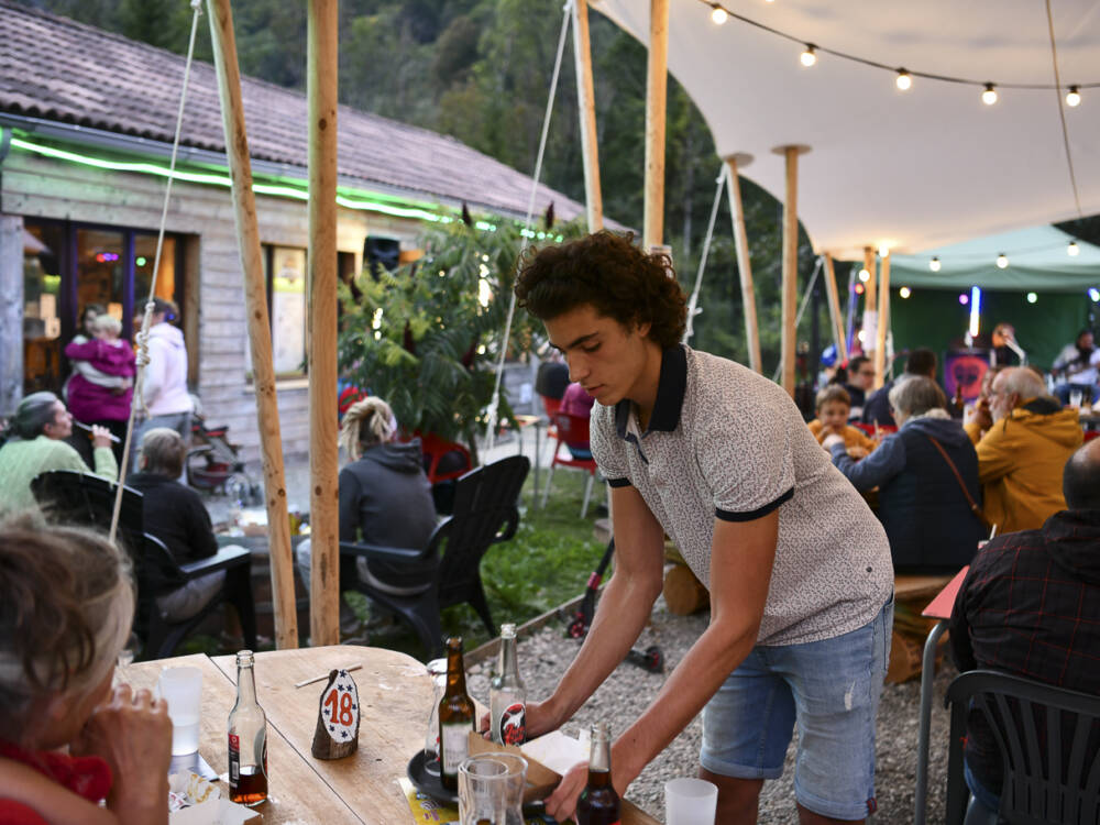 Sous la toile nomade de la terrasse, une ambiance unique se crée au rythme de la Valserine. En juin, les pizzas sont disponibles à emporter les samedis soirs, et en juillet et août, l’accueil se fait du mercredi au dimanche soir. Il est fortement conseillé de réserver à l’avance. Le menu propose une sélection de pizzas accompagnées de boissons locales, idéales pour savourer une soirée estivale en bord de rivière. Un lieu parfait pour un moment de détente et de gourmandise.
