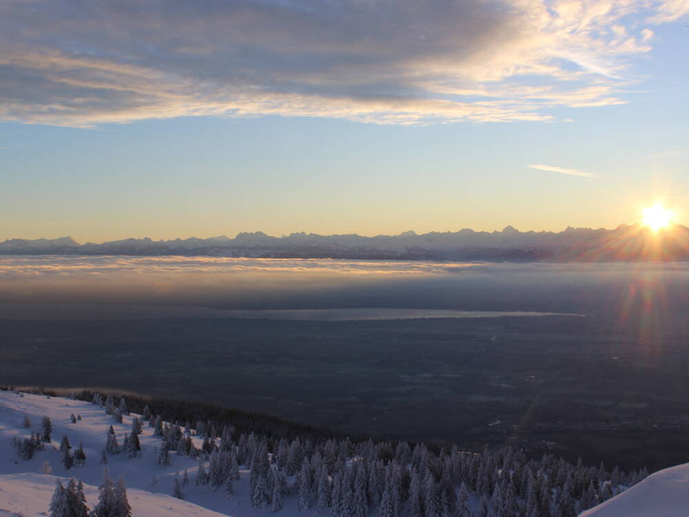Le Crêt de la Neige, plus haut sommet du Jura, vous invite à une échappée en raquettes au cœur de paysages spectaculaires. En chemin, les panoramas se succèdent : Mont Blanc, Alpes suisses, bassin lémanique, Genève toute proche, Salève, défilé de l’Écluse ou encore les Hautes-Combes du Jura… un décor grandiose qui récompense les efforts.