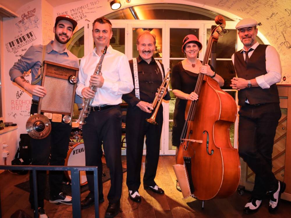 Philippe Anhorn, piano, chant ; Roger Rémy, trompette, chant ; Sophie Martin, contrebasse ; Thomas Winteler, clarinette, saxophone soprano ; Maximilien Anhorn, batterie, washboard, chant.