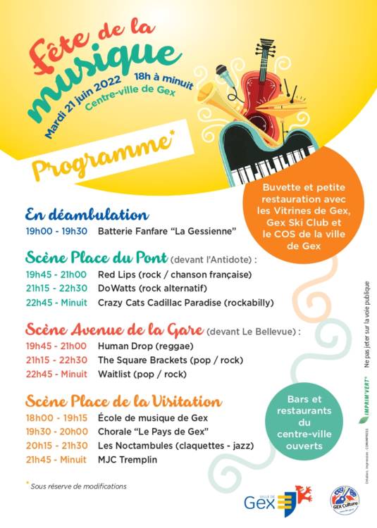 3 scènes seront dispersées en ville : place du Pont, avenue de la Gare et place de la Visitation. Cette année, retrouvez 1 programme réunissant 11 groupes de genres musicaux variés !