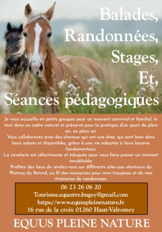 Depuis le Haut-Valromey, partez avec Virginie pour des balades équestres de 1h à 5h, à partir de 3 ans, sur le Plateau de Retord et alentours. Randonnées ouvertes aux enfants et aux adultes, adaptation en fonction du niveau équestre de chacun.