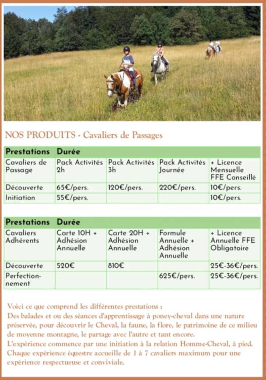 Passionnée par son métier et aimante envers ses animaux, elle attache une attention particulière à la qualité de ses prestations et privilégie les petits groupes afin qu'il y ait un échange humain.