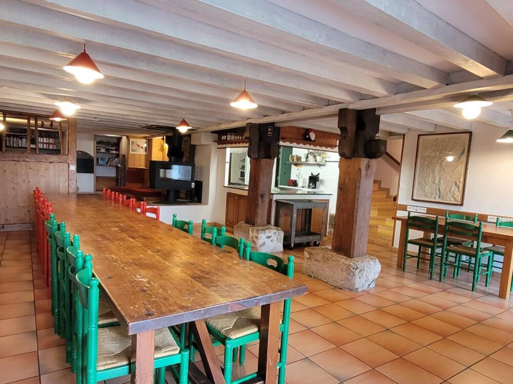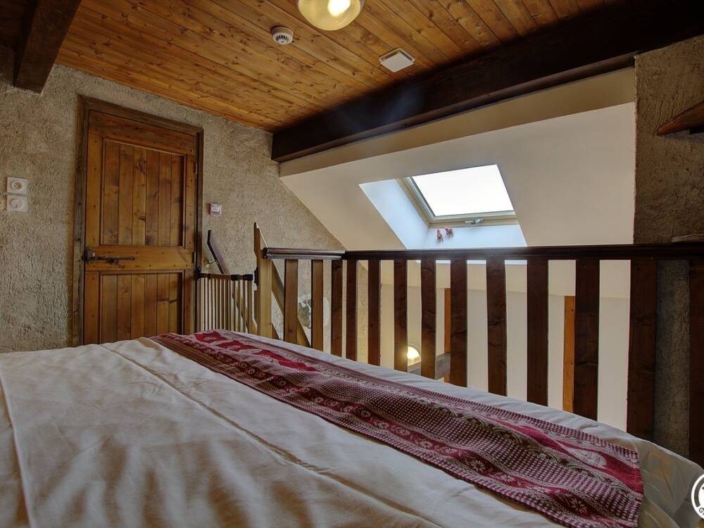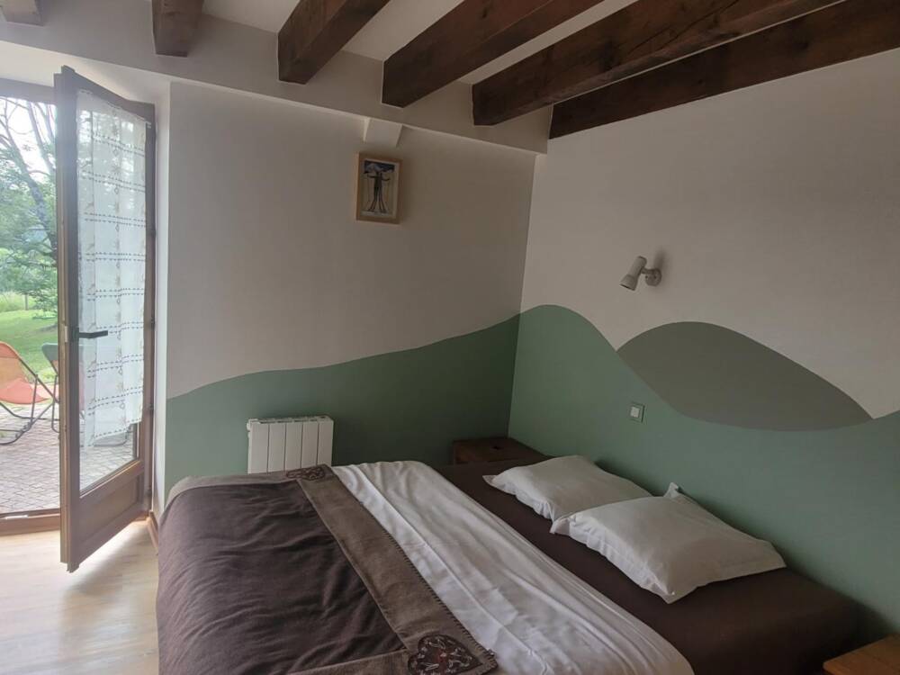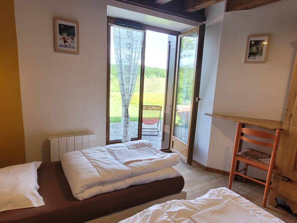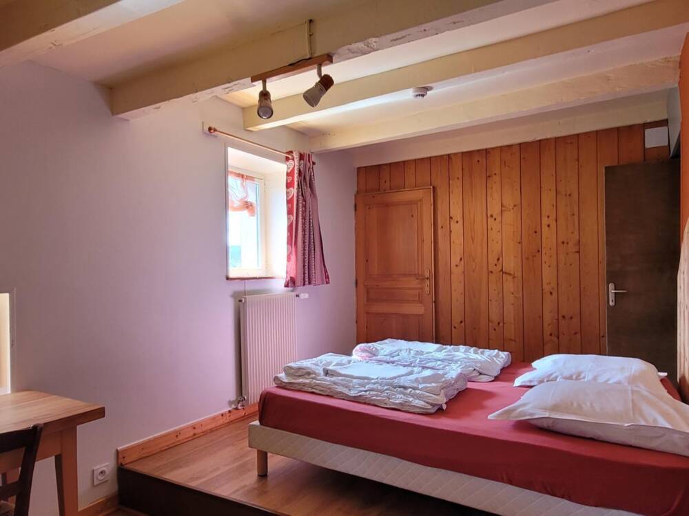 A l’étage, les couchages sont répartis dans 4 chambres avec salle de bain. Une chambre « printemps » avec 5 lits de plein pied, une chambre « été » avec un lit 2 places, une chambre automne avec 6 lits superposés et une chambre « hiver » avec 4 lits de plein pied.