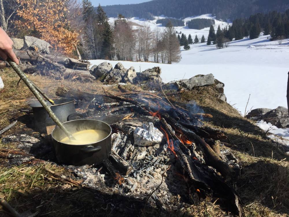 A midi, autour d'un feu de camp, dégustez une délicieuse fondue au Comté et profitez d'un bon repas en pleine nature avant de terminer votre randonnée raquettes.