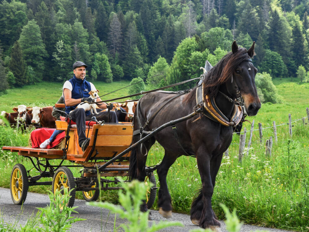 En famille, entre amis, ou tout(e) seul(e), partez en balade à la découverte de la faune sauvage dans la vallée de la Valserine et de la vie pastorale (combe d’en haut à Mijoux) en calèche, et Nicolas vous propose de la privatiser.