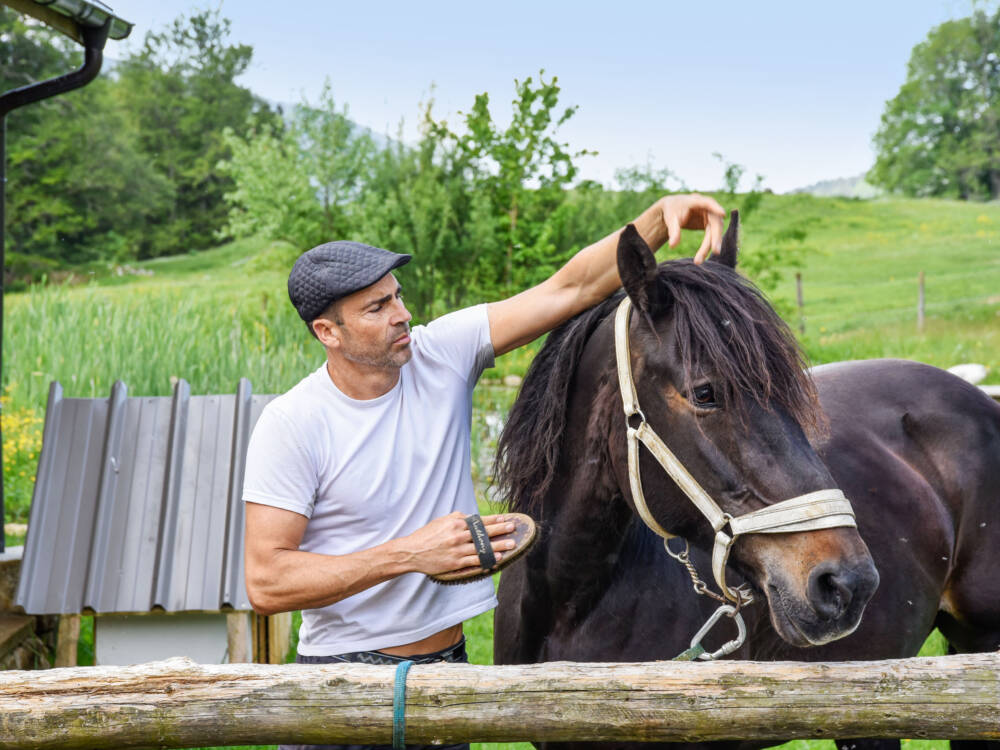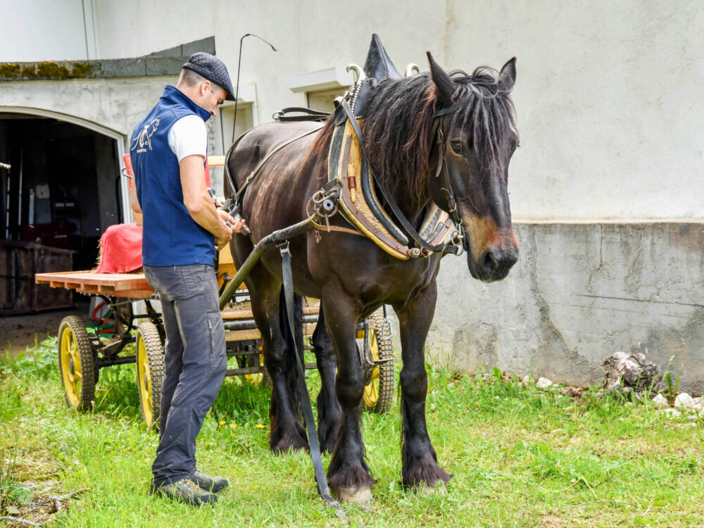 Après 15 minutes de préparation, vous vous familiarisez avec le cheval de trait qui vous emmène en balade.
