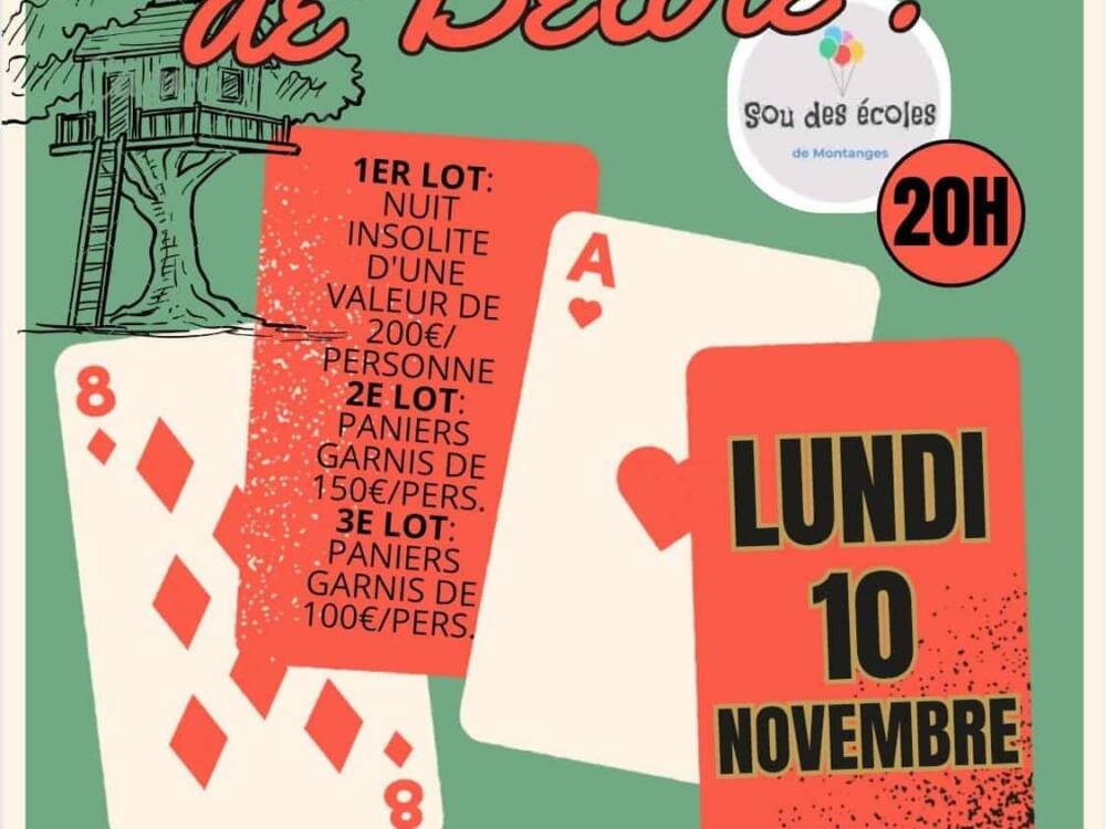 Venez participer à la 42ème édition de la traditionnelle belote du Sou des écoles de Montanges ! Toutes les doublettes seront récompensées.