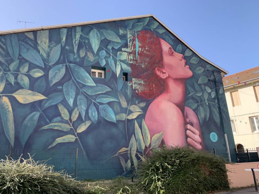 Séduit par la ville de Nantua, Graffmatt est revenu en 2022, y créer une seconde fresque de son Angelina, cette fois entourée de nature.