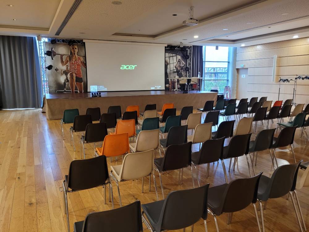 - 2 Espaces pouvant accueillir respectivement jusqu'à 60 et 150 personnes assises. Espaces équipés sur demande (configuration chaises / tables ; grand écran ; rétroprojecteur ; paperboard ; micro ; ...)