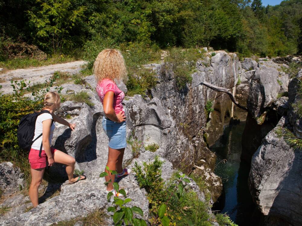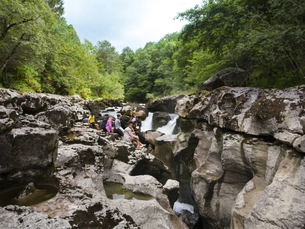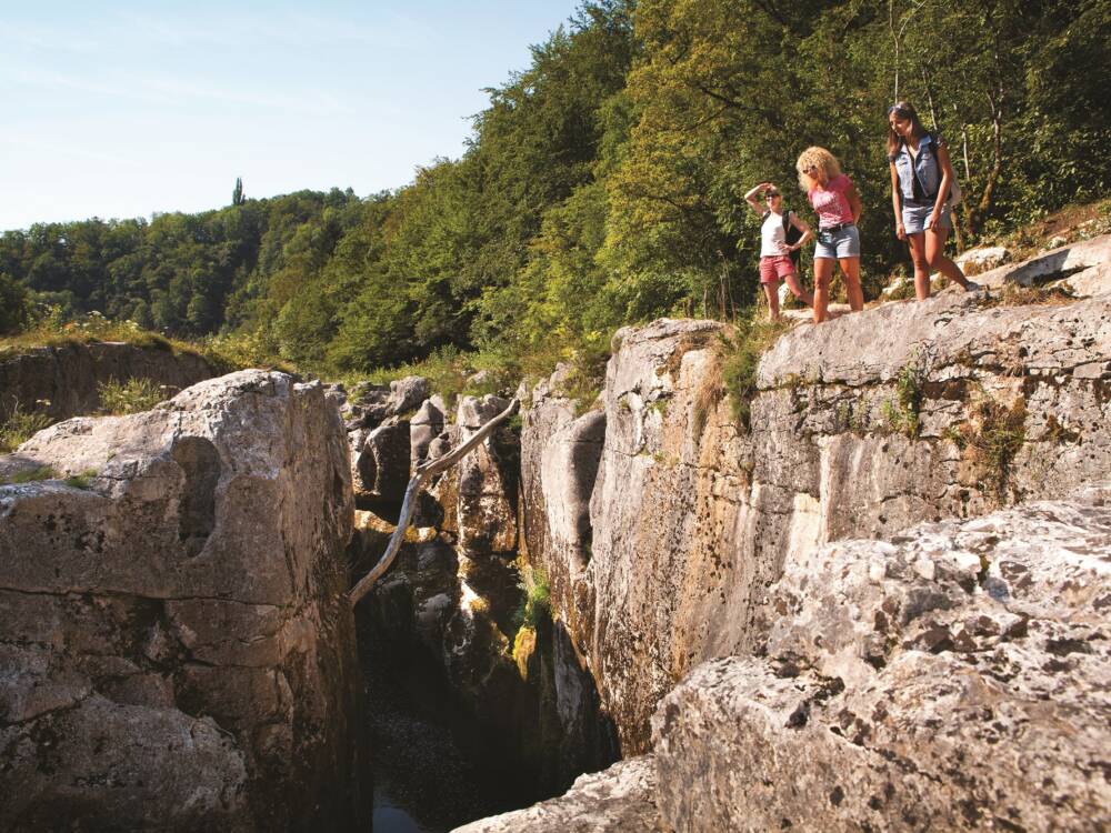 Un sentier aménagé mène aux Pertes de la Valserine, où les eaux de la rivière disparaissent dans un gouffre sans fond, pour réapparaître au-delà d’un labyrinthe de canyons calcaires.