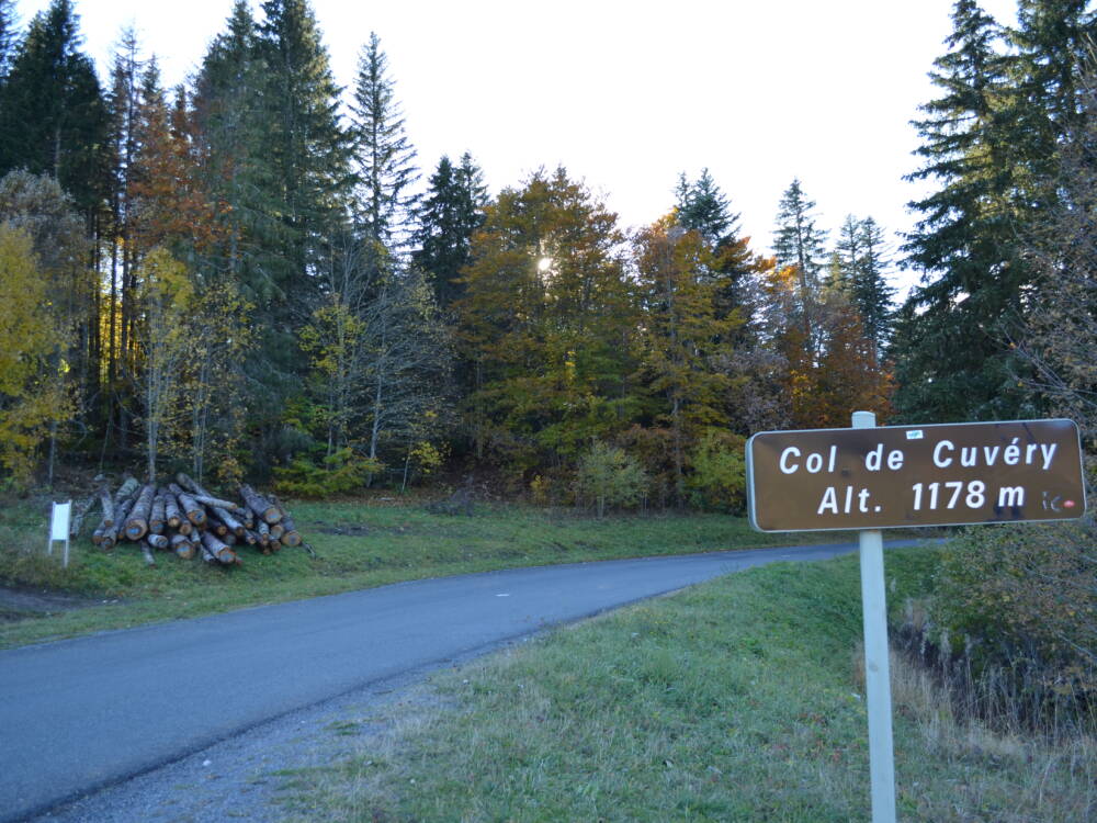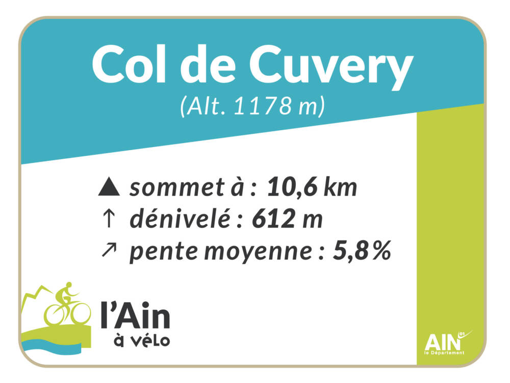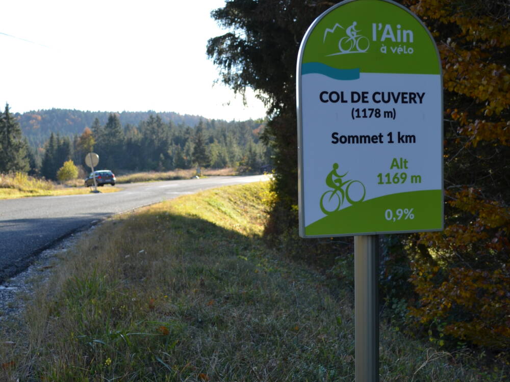 Le Col de Cuvéry (1 178 m) depuis Vouvray (Valserhône, anciennement Bellegarde/Valserine) relie la vallée de la Valserine à la vallée du Séran. Montée douce avec une pente très régulière sans difficultés majeures (% maxi à 7.0 %) avec de nombreux passages en forêts pour arriver sur une vaste combe typique du relief jurassien, et propice à la pratique des activités nordiques en hiver. Parcours idéal pour découvrir le Plateau de Retord avec une magnifique vue sur les Alpes à Catray. Au sommet très beau panorama sur la vallée de la Valserine, le Jura franco-suisse et le Mont-Blanc. Jonction avec le col de Bérentin après la descente en direction Nantua.