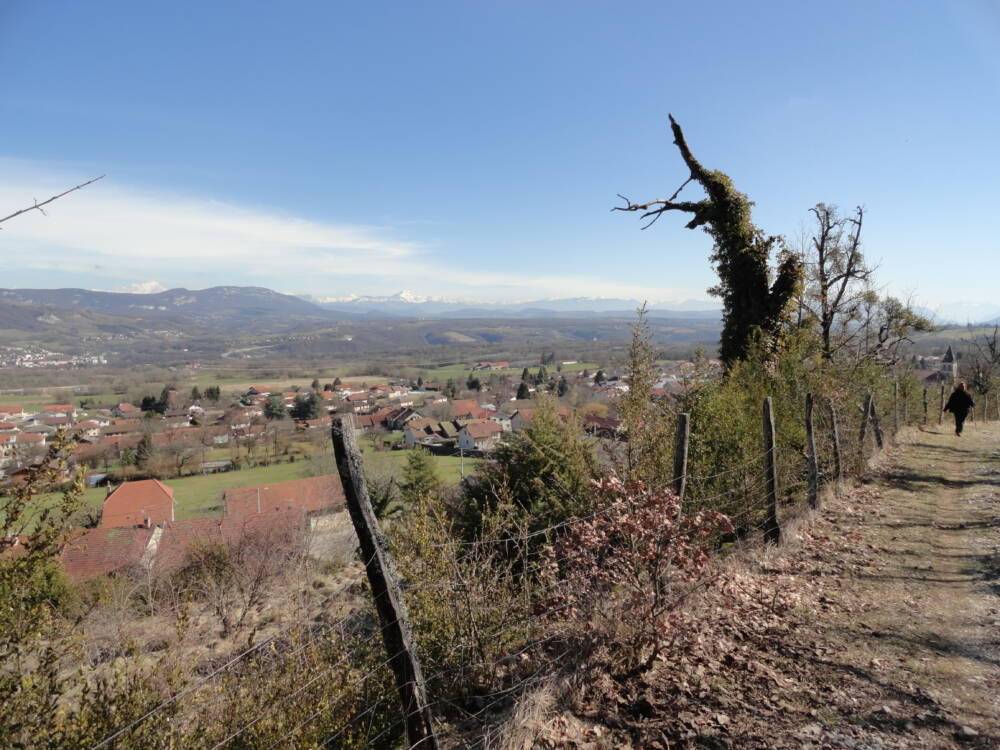 (6) Suivre cette route à droite jusqu’au carrefour de la Chaudavie, au croisement de la D101. Descendre à gauche puis 400 m plus bas, quitter la route pour prendre à gauche le chemin dit « des dames » qui descend à Vouvray. Par temps clair, une belle vue sur les Alpes et le Jura s’offre à vous. Déboucher sur la route de Cuvéry.